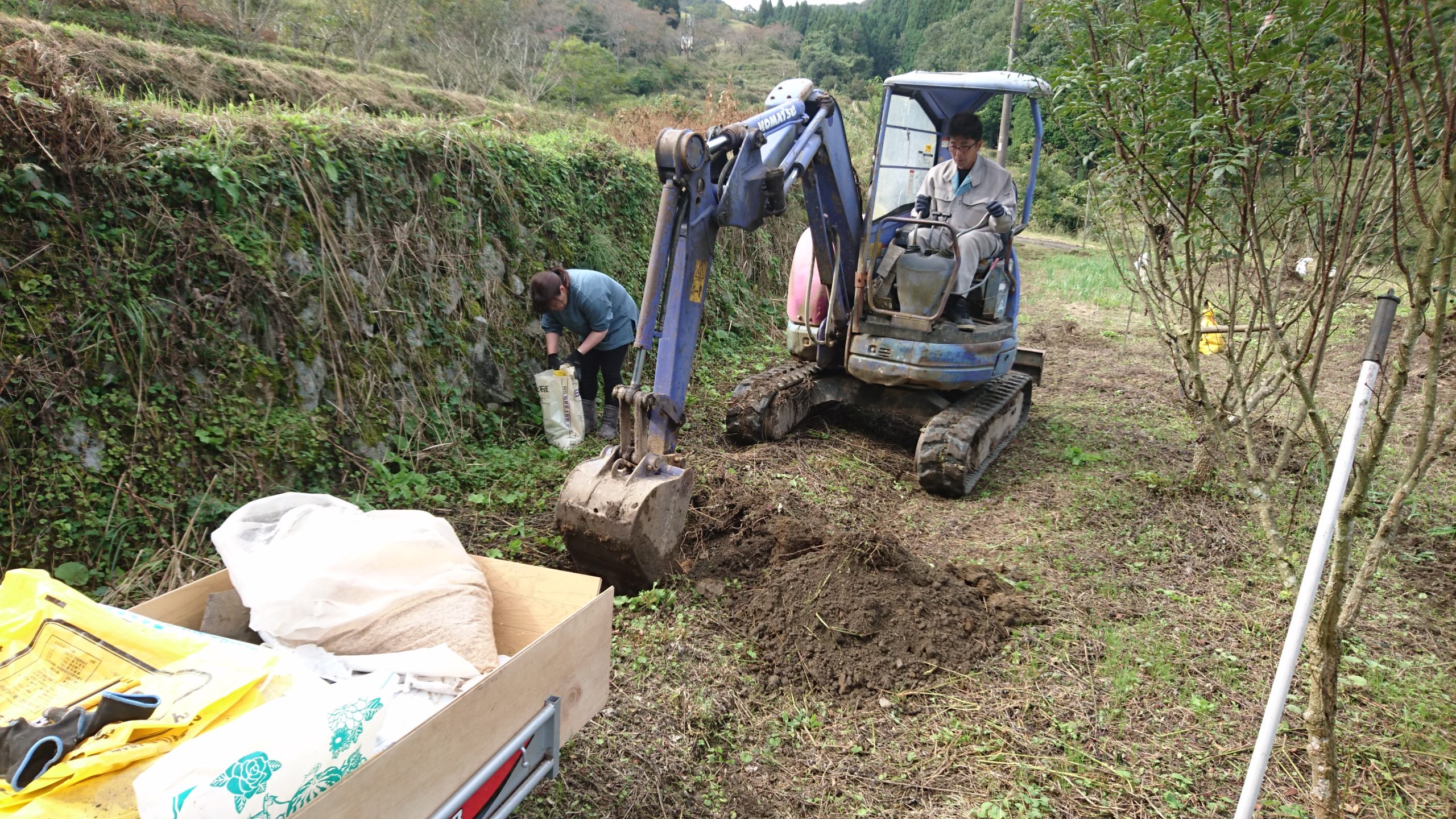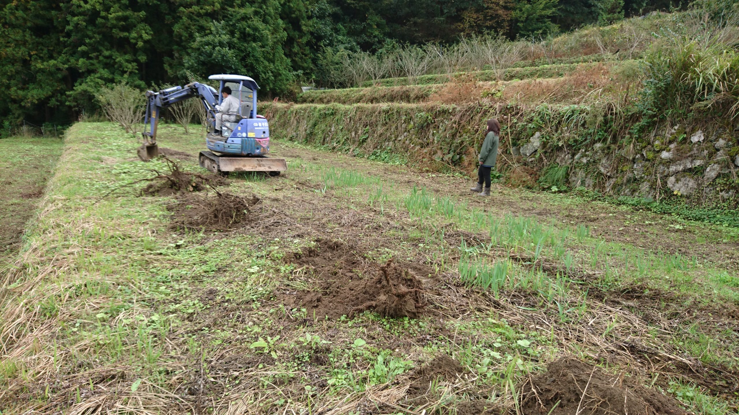 定植準備 今年枯れてしまった朝倉山椒の掘り起こしと処分、定植の準備を妹夫婦とワイワイガヤガヤ楽しく作業しました。途中ユンボのキャタピラーが外れるというアクシデントはありましたが、無事復活し予定通りに作業できました。